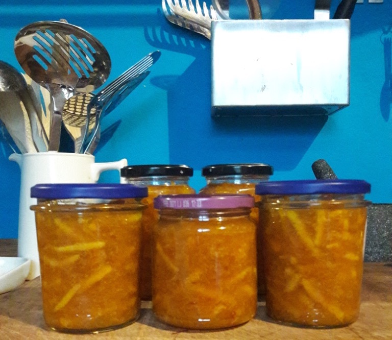 I have since made a second batch of marmalade. I tried a method that was less time consuming than the recipe above and one that used less jam sugar. I was hoping to not to have to use jam sugar at all because I’m not sure I can get it here, although I can get pectin in sachets. The aim was to use what pectin there is the oranges to help set the marmalade and that largely worked. This is less fleshy although very peely, the peel is suspended in a clearer jelly base than the first batch. I’ll work on my recipe and method that came from reading my 3 much used preserving sources, The Modern Preserver, The Good Housingkeeping Complete Book of Preserving and Mrs Arthur Webb’s Preserving and then winging it. I’d like to say that years of preserving means that I can make informed decisions about how to approach it, but that probably only holds true if you really can compare oranges with just about any other fruit, and I’m not so sure.