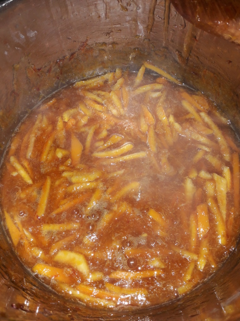 I started with the a recipe from ‘The Modern Preserver” from which a number of the preserves above come. This involved preparing the flesh and separating it from the membranes and pith, chopping up some of the peel, boiling it up and adding it later.