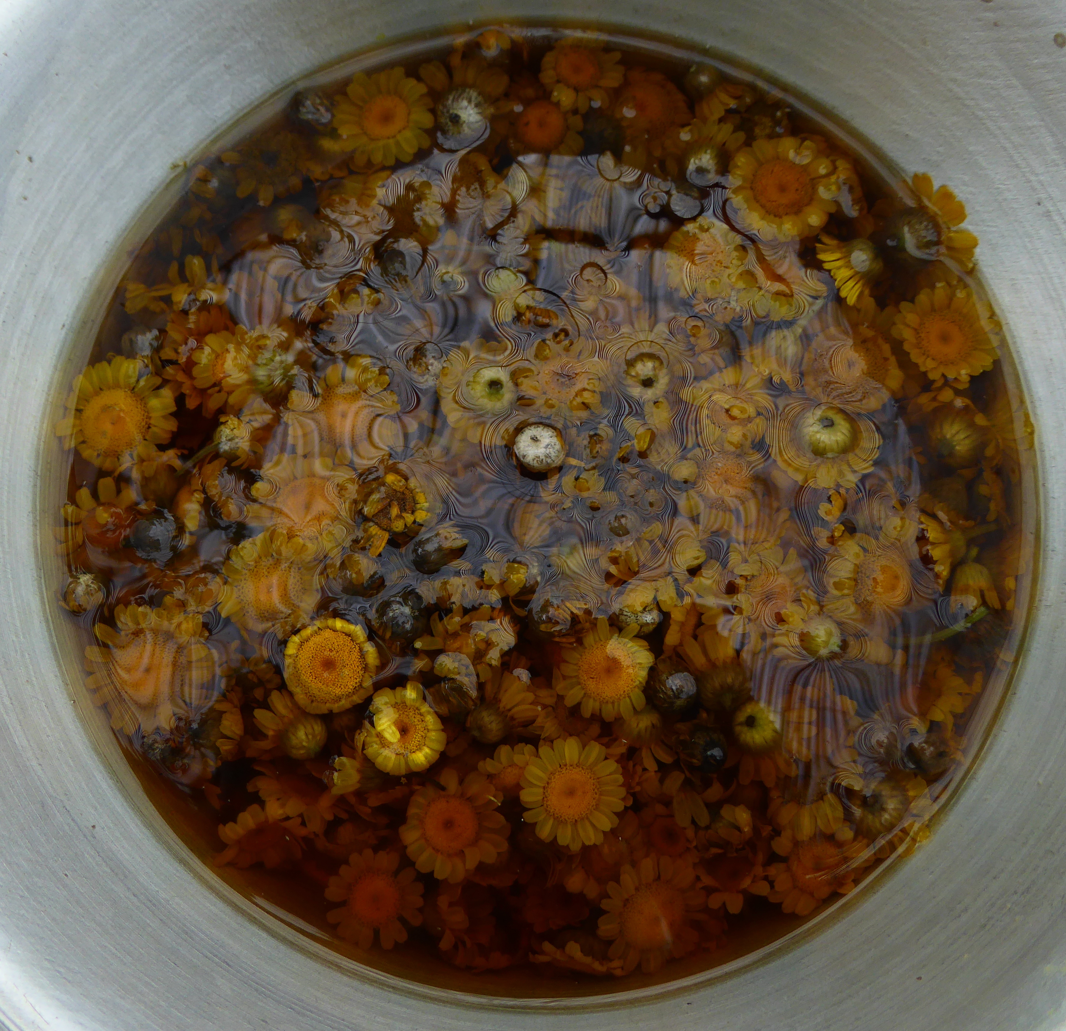I took 80g of semi dry flowers that I’d been collecting over the course of a few dog walks, put them in my aluminium pot and covered them with a litre of boiling water