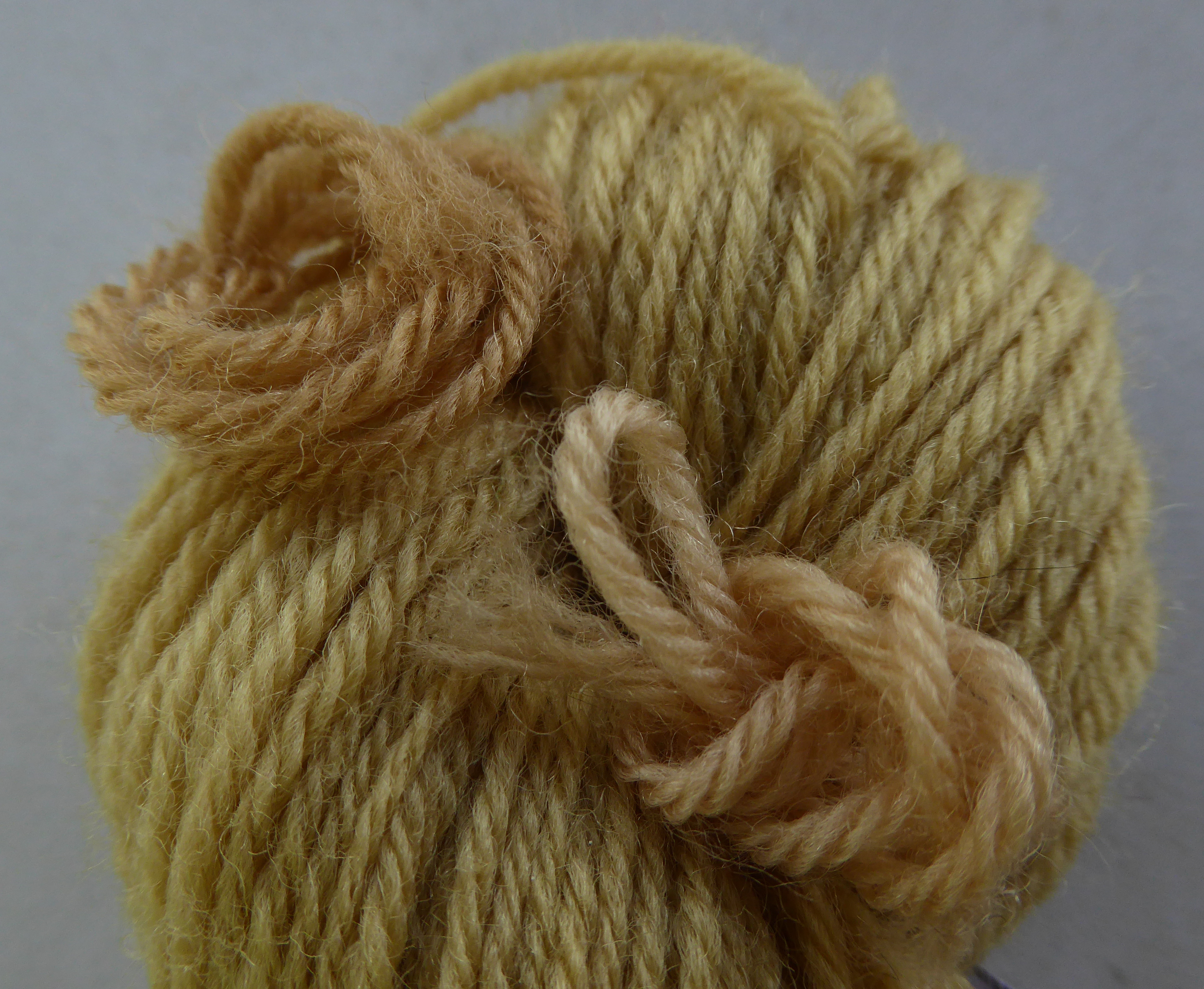 Since dyeing these first 2 skeins I mordanted more yarn with rhubarb as the source of oxalic acid and with alum. I had hoped that I had enough left over from my first experiment to try both, but once I’d started with the rhubarb mordanted yarn I decided there wasn’t really enough colour in the dyepot to give the alum a fair shot as well, so that will have to wait for another time.