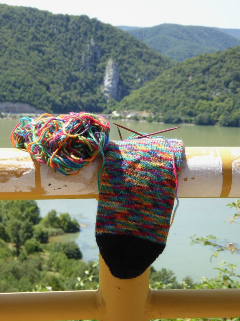 My penchant for hand knits socks has long married perfectly with their portability and simplicity as a project; they can go pretty much anywhere and be worked on easily with little intrusion. They can be worked on while a chatty and sociable car passenger, on the bus or train, or whilst dog walking. In previous years I even used #dogwalkingsocks on Instagram to document my summer sock output; the idea being to knit simple vanilla afterthought heel socks during the summer, then set them aside so that when the weather turns, you can pop in the heels, and you can enter autumn with the excitement of fresh new socks. If you’re really lucky you autumn self will find that your summer self has considerately added the heels already. This slideshow demonstrates quite clearly both how portable socks are, and that I indeed walk the talk of taking them and knitting on them just about everywhere.